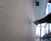 松戸市Sマンションの外壁塗装が終わり、開放廊下・ベランダの防水工事に入ります。防水工事の下地処理としてクラック(亀裂)部にはシーリング処理をして、その後にセメントモルタルを配合したプライマーを床コンクリートに巣穴が出来ないように塗布していきます。 |